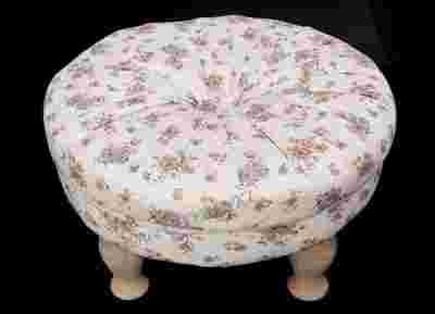 Piękny taboret obity materiałem, na drewnianych nóżkach.