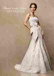 Suknia wykonana z satyny + koronka w kolorze kremowym (haft – krem platyna). Elegancji sukni nadaje wrzosowa szarfa z broszką. Wymiary sukienki: -biust 92 cm -pod biustem 77 cm -talia 73 cm -biodra pierwsze 86 cm -biodra drugie 95 cm -długość spódnicy od paska 114 cm