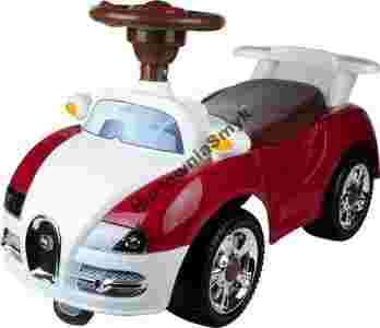 Bardzo ładny, solidnie wykonany jeździk. Posiada podpórki zabezpieczające przed wywróceniem się pojazdu. Jest dość szeroki co sprawia, że maluchy pewnie i stabilnie w nim siedzą. Nie posiada ostrych i niebezpiecznych krawędzi. Kierownica posiada wbudowany moduł dźwiękowy z melodiami , oraz światełka LED. Skręcane są koła przednie Siedzenie posiada możliwość podnoszenia, oraz daje dostęp do "bagażnika".