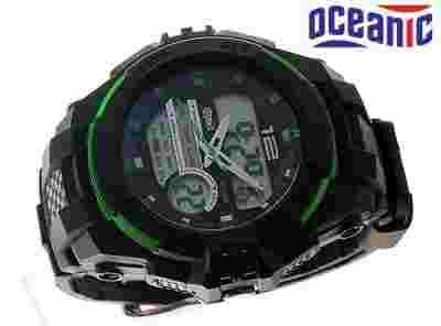 Model zegarka: OCEANIC AD1029 Firma OCEANIC to jedna z najbardziej rozpoznawalnych firm na rynku, która bardzo szybko zdobyła uznanie klientów dzięki wysokiej jakości tworzyw wykorzystywanych do produkcji zegarków. Dzięki temu zegarki są funkcjonalne i wytrzymałe na oddziaływanie czynników zewn. tj. woda, śnieg czy wilgoc OPIS ZEGARKA Przedmiotem aukcji jest wodoszczelny zegarek firmy OCEANIC. Zegarek poddany był testom sprawdzającym między innymi szczelnośc ciśnieniową 10 ATM, co pozwala na bezpieczne użytkowanie praktycznie w każdych warunkach. Funkcje: - Metalowa koperta. - Elastyczny pasek z domieszką kauczuku. - Japoński mechanizm kwarcowy - Iluminescencyjne podświetlenie tarczy(ok 3 sek.) - klasa wodoszczełnosci do 100 m / 10 bar - datownik - kalendarz - czas drugiej strefy - chronograf (stoper) - sygnał o pełnej godzinie - alarm - 12/24 format godzinny - Funkcja timera (odliczanie czasu) Rozmiar koperty: Wysokość 56 mm. Szerokość 53 mm. Grubośc 18 mm.