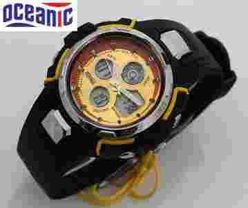 Model zegarka: OCEANIC AD79. Firma OCEANIC to jedna z najbardziej rozpoznawalnych firm na rynku, która bardzo szybko zdobyła uznanie klientów dzięki wysokiej jakości tworzyw wykorzystywanych do produkcji zegarków. Dzięki temu zegarki są funkcjonalne i wytrzymałe na oddziaływanie czynników zewn. tj. woda, śnieg czy wilgoc OPIS ZEGARKA Przedmiotem aukcji jest wodoszczelny zegarek firmy OCEANIC. Zegarek poddany był testom sprawdzającym między innymi szczelnośc ciśnieniową 10 ATM, co pozwala na bezpieczne użytkowanie praktycznie w każdych warunkach. Funkcje: - Metalowa koperta. - Elastyczny pasek z domieszką kauczuku. - Japoński mechanizm kwarcowy - Iluminescencyjne podświetlenie tarczy(ok 3 sek.) - klasa wodoszczełnosci do 50 m / 5 bar - datownik - kalendarz - czas drugiej strefy - chronograf (stoper) - sygnał o pełnej godzinie - alarm - 12/24 format godzinny - Funkcja timera (odliczanie czasu)