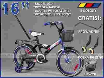 Wyposażenie - Błotniki z tyłu i z przodu; koszyk z tyłu, dzwonek - Błotniki chronią dziecko przed ew. ochlapaniem. Możliwość zamontowania w kilka sekund bocznych kółek 16' i drążka do nauki , do stopniowej nauki jazdy na 2 kółkach.