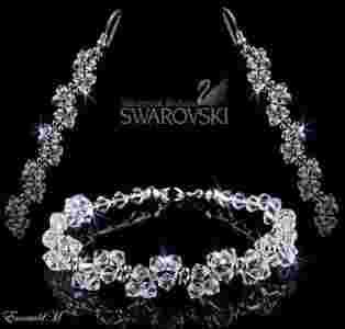 Oferujemy Państwu komplet wykonany z kryształów Swarovski Elements w oprawie srebra próby 925. Bransoletka i wyjątkowo długie kolczyki wykonane są z kryształów wielkości 4mm w kolorze Crystal (krystaliczny). Piękny koronkowy splot kryształów doskonale komponuje się z sukniami ślubnymi oraz wieczorowymi. Kolczyki osadzone są na eleganckich biglach otwartych próby 925.