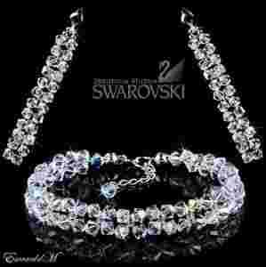 Oferujemy Państwu komplet wykonany z kryształów Swarovski Elements w oprawie srebra próby 925. Bransoletka i długie kolczyki wykonane są z kryształów wielkości 4mm w kolorze Crystal AB (opalizujący, subtelnie mieniący kolorami). Kolczyki osadzone są na sztyftach próby 925.