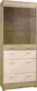 Dwudrzwiowa witryna z półkami szklanymi oraz trzema szufladami.