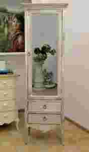 Wysoka szafa bieliźniarka z kolekcji rustykalnej, na całej powierzchni drzwi jest wmontowane lustro, a w dolnej części są dwie szuflady.