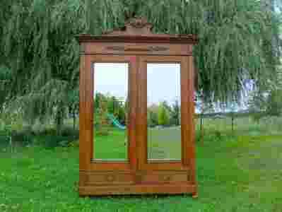 Szafa francuska w dębie. Drzwi z dużymi fazowanymi lustrami, w dolnej części szuflady. Wewnątrz górna półka z rurą na wieszaki. Stan bardzo dobry.