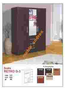 Kolorystyka wybarwień na zdjęciach może różnić się od rzeczywistych kolorów oferowanych mebli. Szafa Retro D-3: -------------------------------------------------- Szerokość : 147cm, wysokość : 200cm, Głębokość : 58cm Stan : nowy. Kolorystyka do wyboru : * venge * venge + dąb mleczny * grusza * olcha