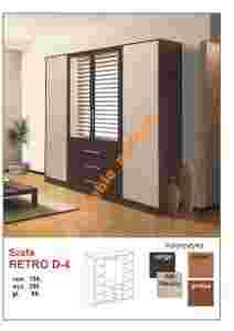 Kolorystyka wybarwień na zdjęciach może różnić się od rzeczywistych kolorów oferowanych mebli. Szafa Retro D-4: -------------------------------------------------- Szerokość : 196cm, wysokość : 200cm, Głębokość : 58cm Stan : nowy. Kolorystyka do wyboru : * venge + dąb mleczny * grusza * olcha