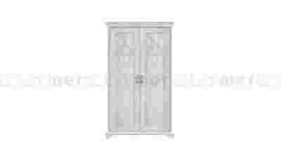 Dwudrzwiowa szafa dostępna w dekorze Pinia Biała. Charakter mebla podkreślają krzyżowe szprosy, masywne cokoły oraz wieniec górny. Całość stylistyki uzupełniają uchwyty w kolorze imitującym stare srebro. Wnętrze szafy jest wyposażone w sześć pojemnych półek oraz drążek na ubrania. Szafa pochodzi z kolekcji mebli KASHMIR.