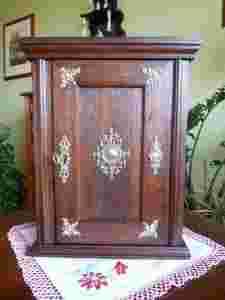 Przedmiotem licytacji jest piękna zabytkowa szafeczka do zawieszenia na ścianie lub postawienia . Przedmiot prezentuje się doskonale i jest naprawdę dekoracyjny . Mebelek pochodzi z przełomu XIX/XX w i wykonano go w stylu eklektycznym . Przedmiot jest wykonany z drewna dębowego . Szafka prezentuje się doskonale ponieważ została odnowiona . Drzwi szafki zdobią bardzo ozdobne okucia z mosiądzu w kolorze złotym . Są one oryginalne z epoki , jedynie okucie przy zamku jest nowsze . Mebelek jest nie tylko bardzo ładny ale i funkcjonalny . Drzwi mebelka zamykają się na klucz . Wnętrze szafeczki kryje szufladkę oraz jedną półeczkę . Na zdjęciach nie widać półeczki ale jest ona w komplecie z szafką ( nie była dorabiana - jest oryginalna z epoki ) . Szafkę można wykorzystać na wiele sposobów we wnętrzach o różnym charakterze . Może ona służyć , np. jako szafka na klucze , apteczka czy schowek na różne drobiazgi czy bibeloty . Z tyłu szafki znajdują się dwa uchwyty służące do zawieszenia jej na ścianie . Szafka jest naprawdę piękna i stylowa . Stan zachowania : bardzo dobry . Nie ma żadnych pęknięć czy śladów po owadach . Jak widać na zdjęciach brakuje fragmentu środkowego zdobienia na drzwiach mebelka . Ubytek ów nie rzuca się w oczy i jest widoczny dopiero gdy o nim wiemy , nie mniej istnieje . Na żywo przedmiot prezentuje się o wiele lepiej niż na fotografiach . Polecam .