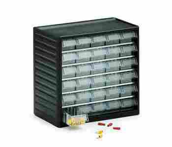 Szafki magazynowe z przeźroczystymi szufladkami.