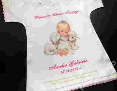 ze zdjęciem dziecka oraz wyhaftowanym aniołkiem.