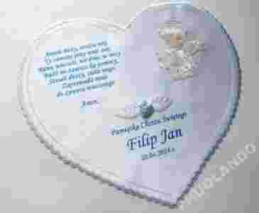 z haftowanym aniołkiem oraz wierszykiem/modlitwą według Państwa projektu.