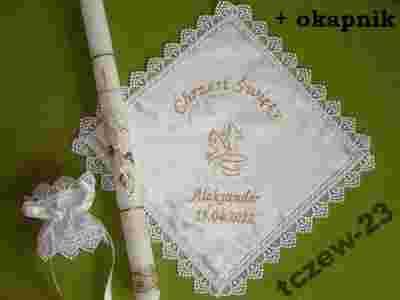 z haftowanym imieniem i datą chrztu