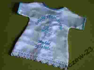 z haftowanym imieniem i datą chrztu