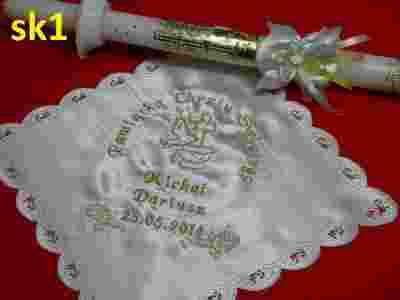 (z wyhaftowanym wedle życzenia: motywem, imieniem i datą chrztu), świeca - gromnica + okapnik.