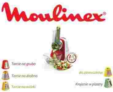 Wielofunkcyjny rozdrabniacz do warzyw DJ756, marki Moulinex, w kolorze biało-czerwonym, o mocy 150 W, z linii Fresh Express +. Model ten wyposażony został w kolorowe akcesoria: do tarcia drobnego, do tarcia grubego, do ucierania, do cienkiego krojenia oraz do tarcia.