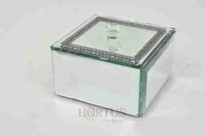 Oryginalna i bardzo estetycznie wykonana szkatułka. Całość ze szkła - luster zdobionych szlifem na każdym brzegu. Pokrywka dodatkowo zdobiona czarnym wzorem. Środek wyłożony czarnym, miękkim materiałem.