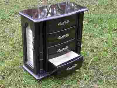 PRZEDMIOTEM MOJEJ AUKCJI JEST oryginalna szkatułka na biżuterie , przepięknie wykonana z dobrego gatunkowo drewna ze szczególną dbałością o wszystkie zdobienia i detale. Szkatułka - komoda jest bardzo duża i pojemna. Z dwóch stron szkatułki znajdują się przeszklone drzwiczki - jedna przegródka na pierścionki a druga z haczykami na naszyjniki i bransoletki.