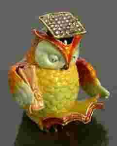 Niezwykła szkatułka w formie sowy czytającej książkę, stylizacją nawiązująca do dzieł słynnego jubilera P.C. Faberge. Kompozycja wykonana współcześnie, emaliowana, inkrustowana kamieniami półszlachetnymi oraz perełkami. Bardzo dekoracyjny drobiazg. Świetny pomysł na prezent przy wielu okazjach.