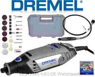 Dremel 3000, zestaw 25 sztuk akcesorii (opis powyżej), wałek giętki Dremel, płytę DVD z przykładami kreatywnych zastosowań narzędzia, pojemną i wytrzymałą walizkę z tworzywa sztucznego do przechowywania narzędzia i osprzętu, instrukcję w języku polskim, kartę gwarancyjną oraz dokument zakupu (FAKTURA VAT), bez którego gwarancja jest nieważna !!!