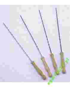 Solidnie wykoanne szpilki do szaszłyków wyprodukowane ze stali szlachetnej chromowanej, wyposażone w drewnianą rękojeść, o całkowitej długość 39 cm.