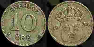 Szwecja, 10 ore, Ag, 1934