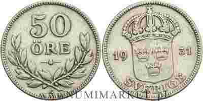 Szwecja, 50 ore, 1931 rok, G, Ag
