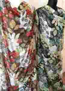 1)Tło brązowe z ecri ,kwiaty ceglaste i szmaragdowe,tkanina mieni sie ładnie
