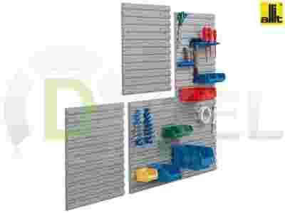 Zestaw pojemników i wieszaków na narzędzia. Zawiera dwie tablice naścienne, pojemniki magazynowe, haczyki, półki i wieszaki na narzędzia.