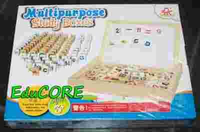 W komplecie drewniana kasetka z tablicą magnetyczną oraz mnóstwo elementów z magnesami do wesołej i kreatywnej nauki: cyfry litery znaki matematyczne kolorowe obrazki