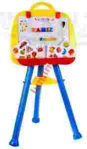 Tablica magnetyczna + pisaki JUMBO. Tablica magnetyczna posiada łapki do mocowania kartek, na których można rysować kredkami. W górnej części ma uchwyt ułatwiający przenoszenie. Kanty w tablicy są zaokrąglone. Osadza się ją na masywnym plastikowym stojaku, który ma regulowaną wysokość nóg. Dzięki temu można dostosować wysokość tablicy do wzrostu dziecka.