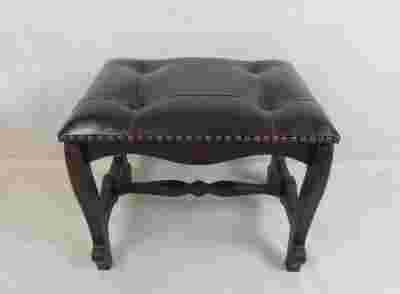 Piękny, stylowy taboret ozdobiony metalowymi ćwiekami. Siedzisko tapicerowane jest eko skórą w kolorze ciemny brąz, nogi są drewniane.