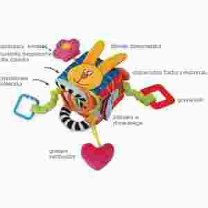 Kostka kryje w sobie mnóstwo niespodzianek. Ma ciekawe faktury i nadruki, plastikowe kółko gryzaczek, bezpieczne lusterko oraz melodyjkę. Daje dziecku wiele możliwości działania. Można ją łatwo zamocować do każdej barierki, łóżeczka, wózka spacerowego i fotelika samochodowego.