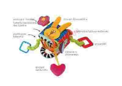 Kostka kryje w sobie mnóstwo niespodzianek. Ma ciekawe faktury i nadruki, plastikowe kółko gryzaczek, bezpieczne lusterko oraz melodyjkę. Daje dziecku wiele możliwości działania. Można ją łatwo zamocować do każdej barierki, łóżeczka, wózka spacerowego i fotelika samochodowego.