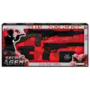 Zestaw zawiera: karabin maszynowy i pistolet z tłumikiem na kapiszony (w kolorze czarnym), lornetkę oraz legitymację agenta. Legitymacja jest przygotowana do wypełnienia oraz naklejenia zdjęcia i voilà.. jesteś tajnym agentem i ratujesz cały Świat od zagłady!!!