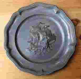 TALERZ OZDOBNY, CYNOWY, METALOWY, STATEK