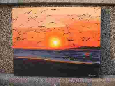 Tanio! Oryginalny obraz - zachód słońca i ptaki