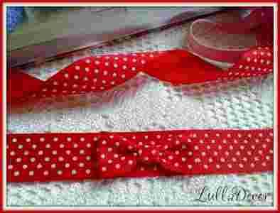 Na tej aukcji dostępna jest tasiemka w kolorze czerwonym w białe kropki.