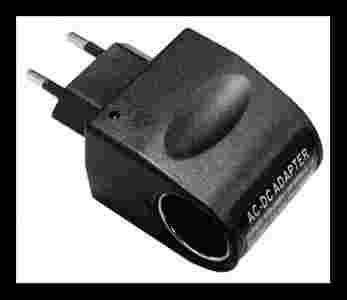 Adapter umożliwiający korzystanie w domu, hotelu z urządzeń przeznaczonych do samochodu, o niewielkim poborze prądu, takich jak np. ładowarki samochodowe do telefonów komórkowych, palmtopów, GPS-u, odtwarzaczy MP3, PSP, transmiterów FM, itp.