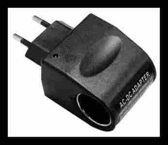 Adapter umożliwiający korzystanie w domu, hotelu z urządzeń przeznaczonych do samochodu, o niewielkim poborze prądu, takich jak np. ładowarki samochodowe do telefonów komórkowych, palmtopów, GPS-u, odtwarzaczy MP3, PSP, transmiterów FM, itp.