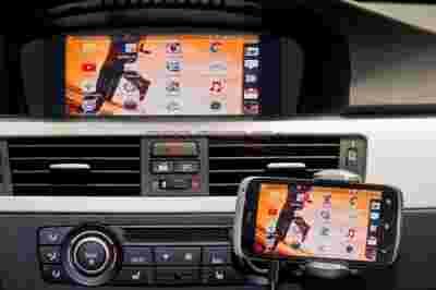 - Wszystkie funkcje smartfonu pojawią się na wyświetlaczu w samochodzie poprzez oryginalny system kontroli samochodu (i-Drive)