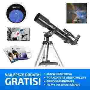 W zestawie znajdują się 2 okulary Kellnera 10mm i 25mm. Dodatkowo w komplecie jest też soczewka Barlowa 2x pozwalająca na uzyskiwanie dwóch górnych powiększeń. Teleskop posiada w komplecie nasadkę kątową lustrzaną 1.25" oraz szukacz 5x24.