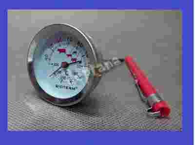Solidnie wykonany termometr ze stali nierdzewnej, idealny do pieczenia różnego rodzaju mięs. Specjalna podziałka precyzyjnie wskazuje idealna temperaturę pieczenia drobiu, wieprzowiny, cielęciny, jagnięciny oraz wołowiny. Czujka termiczna znajduje się w obszarze między 1.3 cm a 5 cm od początku szpikulca. W celu uniknięcia zabrudzeń lub uszkodzenia, szpikulec termometru należy przechowywać w plastikowej osłonce, która znajduje się w komplecie. Zakres temperatur od 30°C do + 100°C; +50°C +300°C Tolerancja błędu do ok +/- 2°C