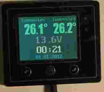 W kolejnych liniach wyświetlacza zostanie wyświetlona kolejno , temperatury dla dwóch czujników, napięcie, czas i data. Na dole wyświetlacza wyświetlają się na przemian komunikaty alarmowe i inne: