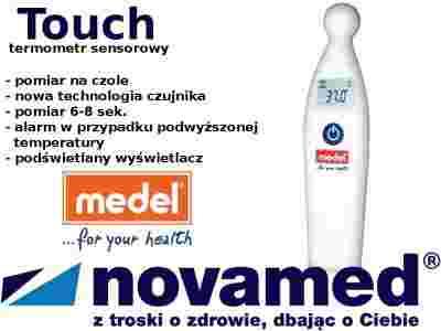 Termometr zapamiętuje ostatni pomiar oraz alarmuje w przypadku wystąpienia gorączki. Termometr Medel Touch posiada duży, czytelny wyświetlacz LCD. Kształt termometru jest ergonomiczny, wygodny i łatwy w użyciu. Przed każdym użyciem termometry należy osuszyć i oczyścić skórę. Po użyciu sensor termometru należy przetrzeć alkoholem i osuszyć.