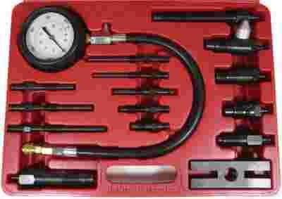 * Zestaw zawiera miernik ciśnienia do 70 BAR (1000 PSI) z przewodem, szybkozłączem i zaworem zwalniającym, 4 adaptery montowane w miejscu wtryskiwacza, 9 adapterów montowanych w miejscu świecy żarowej, jeden adapter uniwersalny oraz mocowanie typ H dzięki czemu pasuje do większości marek samochodów: