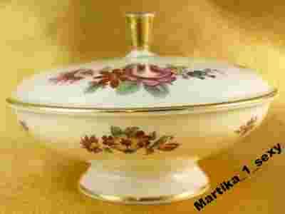 uroczą,starą bombonierę pochodzącą ze znanej i cenionej manufaktury porcelany Thomas Ivory.Obiekt wykonany z najwyższej jakości porcelany w kolorze kości słoniowej.Na czole jak i na przykrywie wkomponowana bardzo efektowna,bogata,intensywna dekoracja kwiatowa o wspaniałym nasyceniu barw.Kontrur porcelany i sterczyne wzbogacono złotem.Uwagę zwraca forma oraz doskonała jakość.Artykuł prezentuje się bardzo ładnie.Zachwyca blaskiem i urokiem.Polecam.
