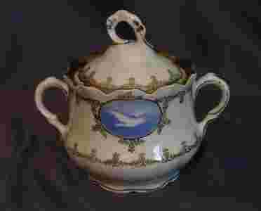 Biała porcelana, reliefy, motyw gołębi w medalionie.